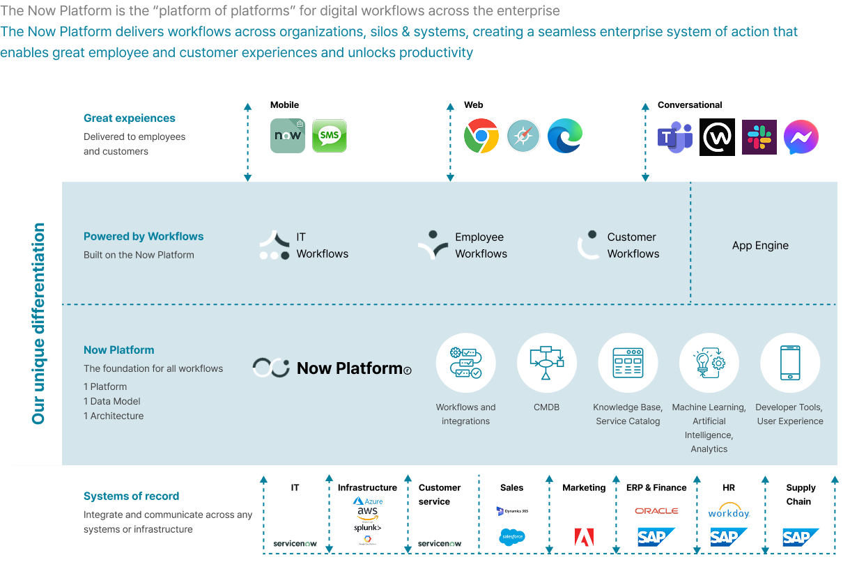 ServiceNow는 기업 내 모든 프로세스를 하나의 통합된 플랫폼에서 관리할 수 있도록 다양한 서비스와 애플리케이션을 지원합니다.